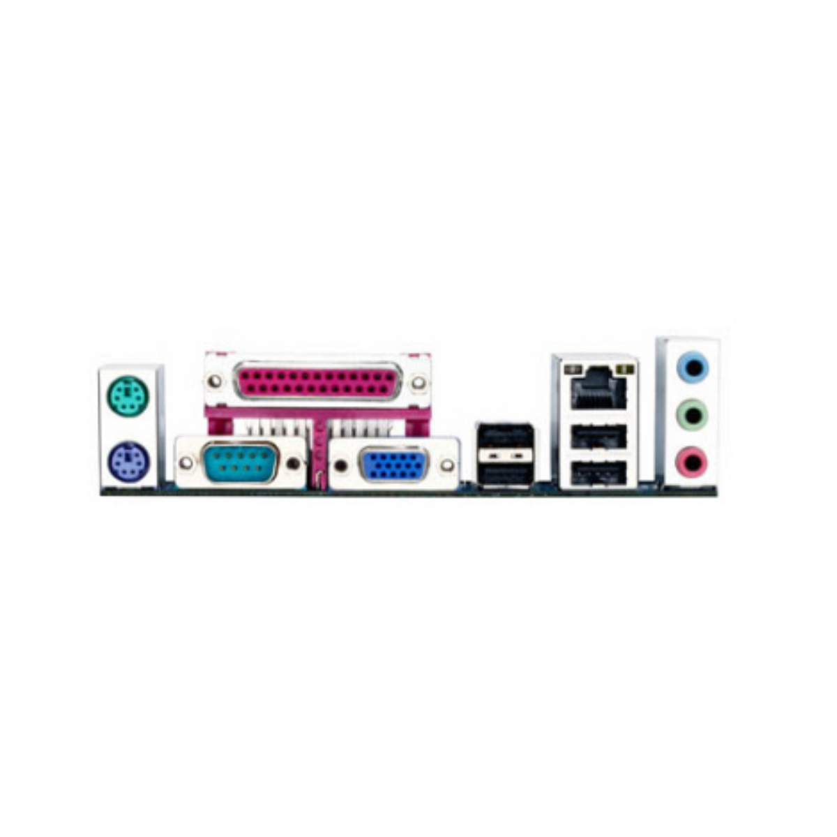 Conectores traseiros: PS/2 teclado, PS/2 mouse, VGA, serial, paralelo, USB 2.0, RJ-45, conectores de áudio